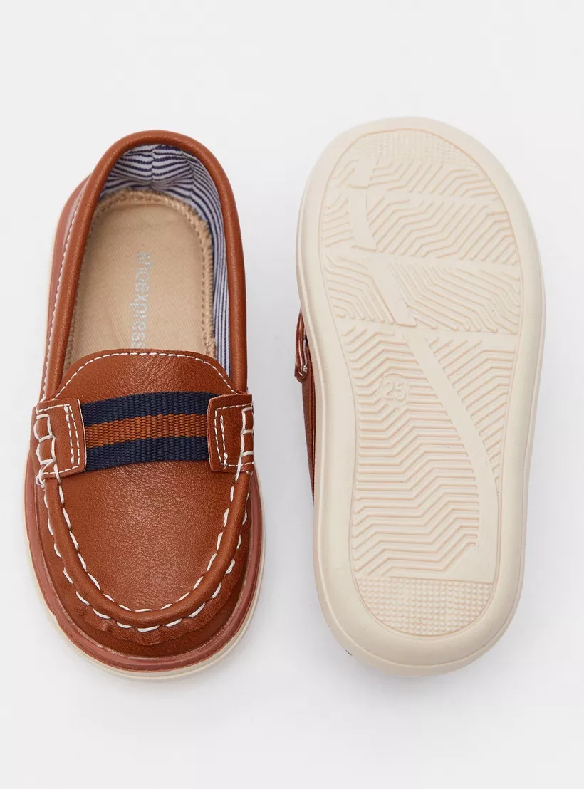 Help your kid exude class and effortless charm by making him wear these stylish moccasins that are enhanced in a striking tone. The upper is enhanced with a striped belt accent and a stitch detail around the borders.