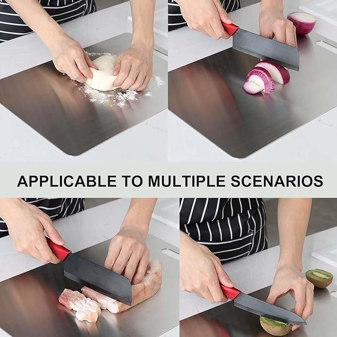 Experience the ultimate in kitchen convenience with our double-sided stainless steel cutting board. Expertly crafted for superior durability, this versatile board is ideal for preparing fish, vegetables, fruits, and meat. Its sleek, hygienic surface resists stains and odors, ensuring a clean and safe workspace every time. Easily switch between sides to help prevent cross-contamination and streamline your food prep. Effortless to clean, dishwasher-safe, and designed with a modern, silver finish, this cutting board is available in multiple sizes to perfectly suit your kitchen needs. Upgrade your culinary experience with this must-have kitchen essential.
