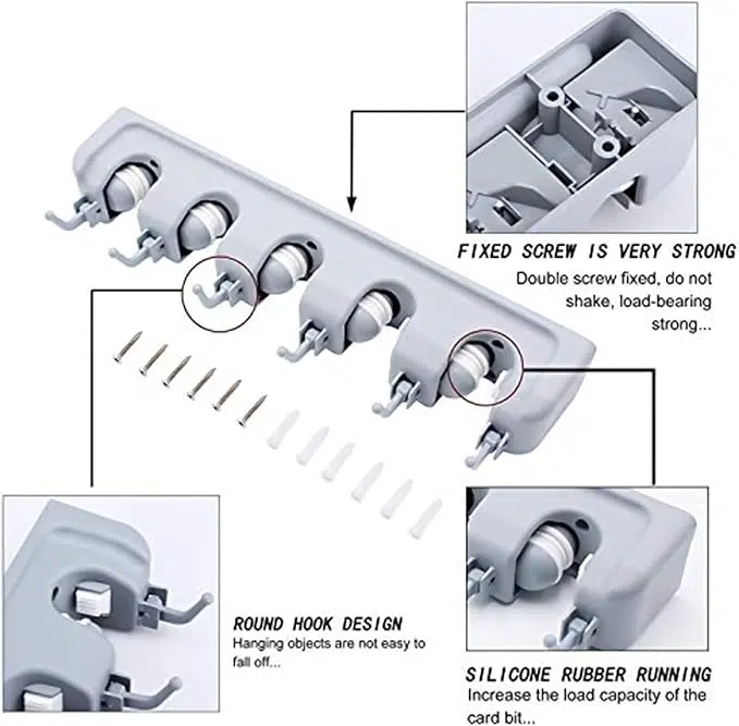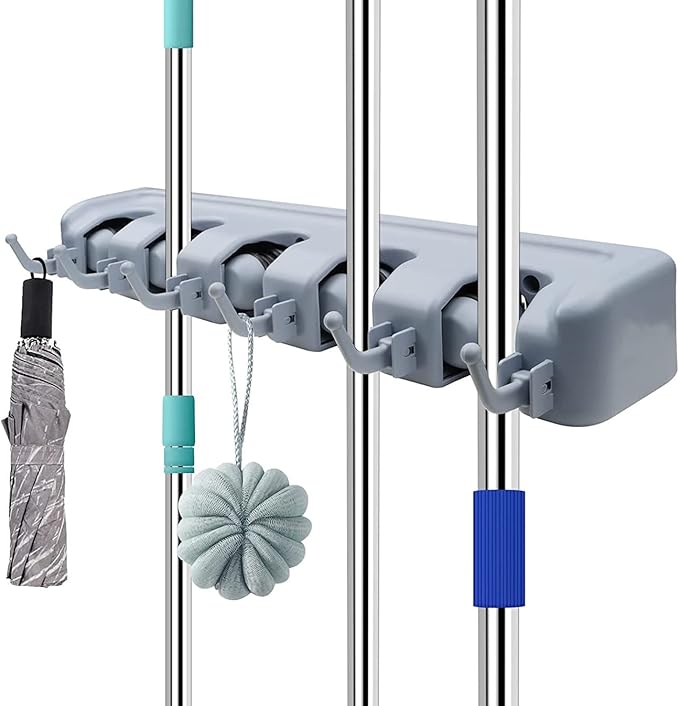Keep your home or garage organized and clutter-free with this premium wall-mounted broom holder. Featuring five sturdy slots with adjustable grips and practical hooks, it securely holds brooms, mops, dusters, and other cleaning tools of various sizes. Its sleek, space-saving design fits seamlessly into kitchens, laundry rooms, or utility areas. Crafted from durable materials for long-lasting use, this holder is easy to install and available in neutral colors to complement any décor. Perfect for maximizing storage and keeping your cleaning essentials within reach.